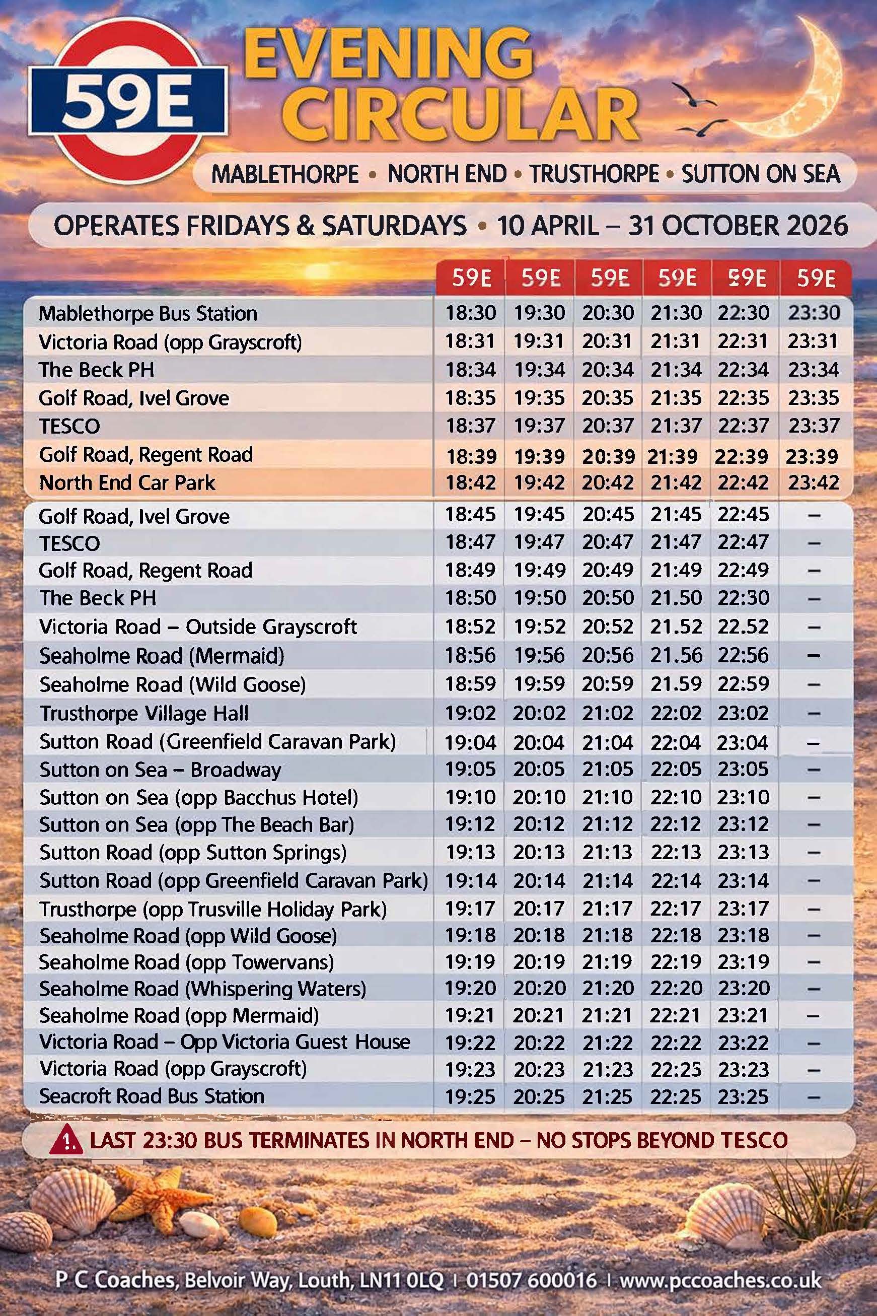 Operated by P C Coaches of Lincoln, the service resumed on Friday 10th April and will now run every Friday and Saturday evening until Saturday 31st October 2026. The route links Mablethorpe Town Centre with North End, Trusthorpe, and Sutton on Sea, restoring a vital transport connection after months without evening services.