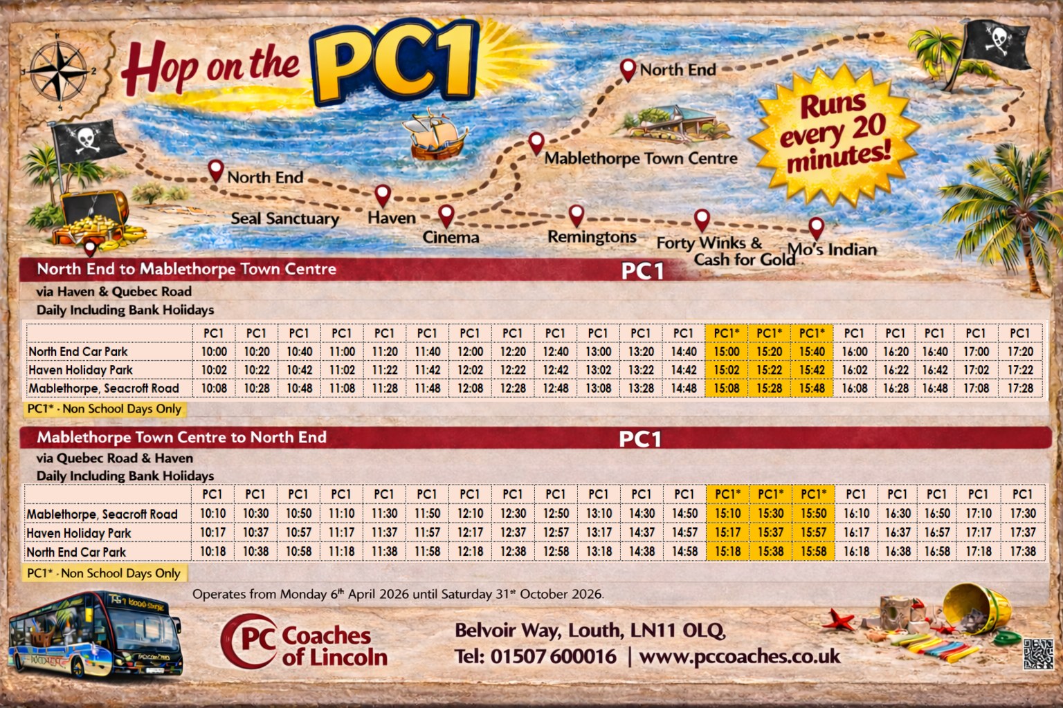 If you are visiting Mablethorpe during the day time then why not try our PC1 Seafront Service, click here to download your PC1 timetable.
